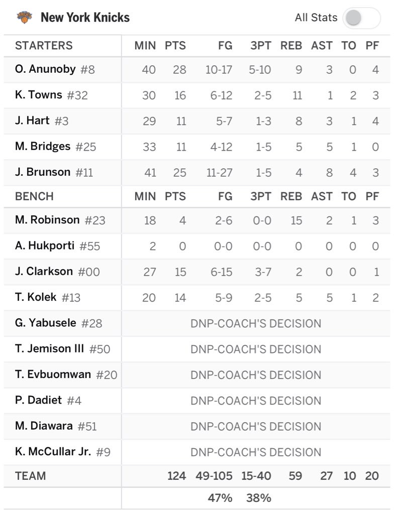 Castle qui score, Kolek qui manque un 3, rebond Knicks, JB court mais Mitch au dunk. Kornet marque aussi, 106-101 à 6:37. Échec Knicks, faute de Brunson qui donne un 1/2 sur la ligne pour Castle qui était à 11pts/11ast avant ça. Towns reste sur le banc mais OG remplace Mikal.