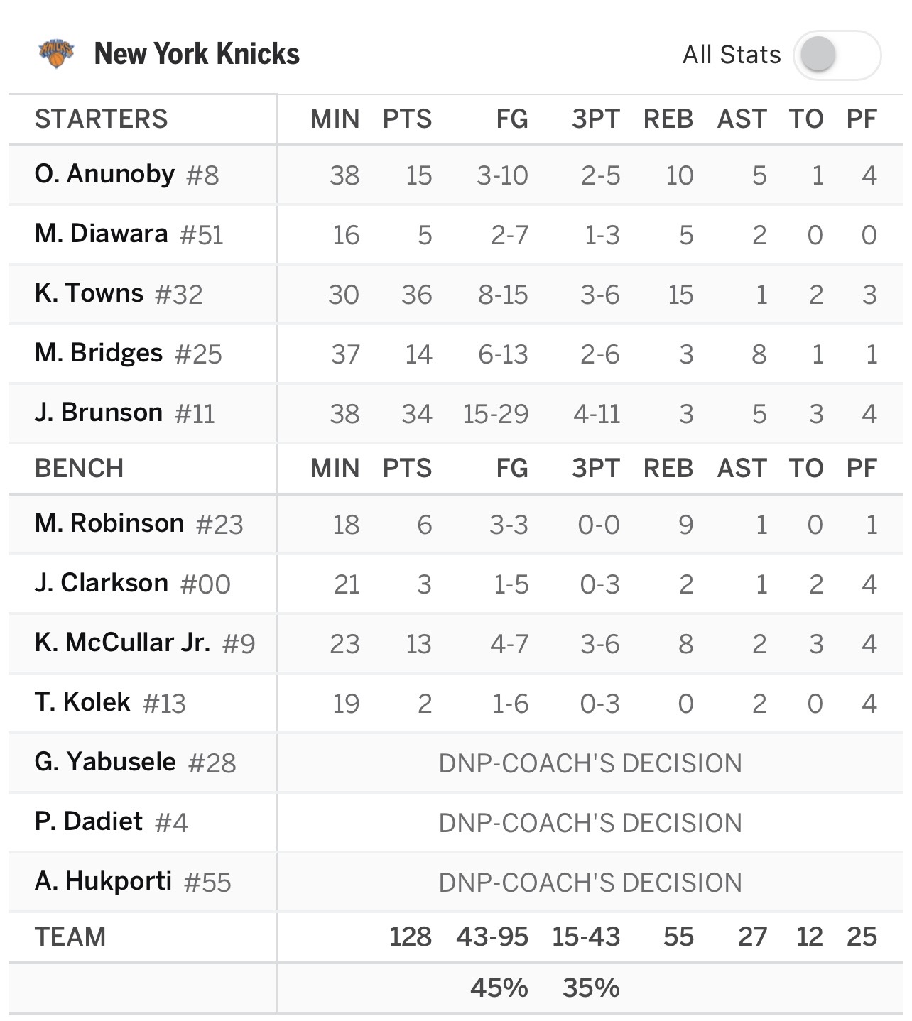 Victoire sur le score final de 128-125, les Knicks ont joué à se faire peur mais l’essentiel est là avec une victoire pour démarrer ce road trip de 3 matchs. La surprise du chef s’appelait cette fois McCullar.