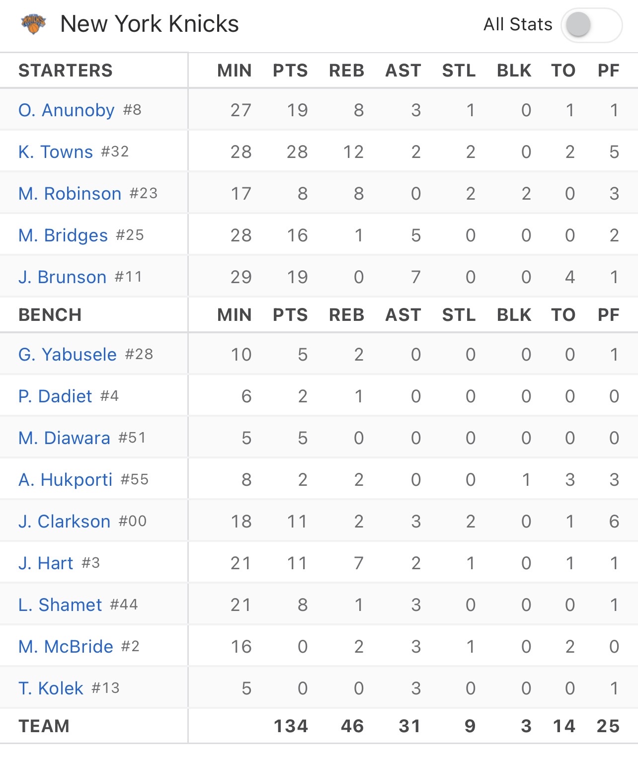 Au retour des vestiaires les Knicks n’ont pas de quoi s’inquiéter par l’adversité mais il faut néanmoins rester concentré jusqu’au bout. Une large victoire permettrait une ouverture du banc en fin de rencontre mais on n’y est pas encore. Le 3eme quart reprend avec les starters du soir, échec à 3 des Nets, rebond Towns, corner 3 pour OG qui en est à 4/5 de loin. Échec à 3 pour Mann, KAT veut partir en drive mais coince, JB au large manque son shoot mais Mitch est au rebond offensif. Mikal manque un 3, Porter Jr se fait contrer et prend même une faute offensive au passage.
