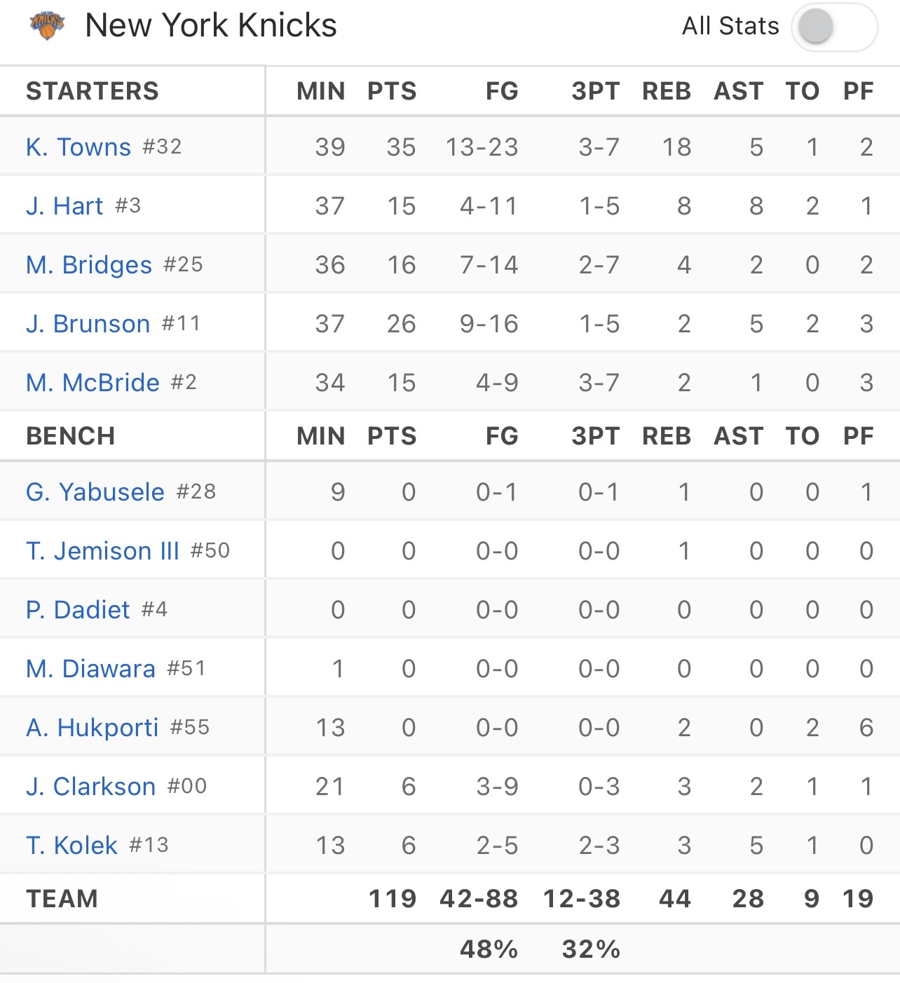 À 1:31 de la pause le score passe alors à 49-45, KAT trouve Josh dans la raquette mais Sexton sort le ballon. Retour de Moussa, le ballon passe de main en main pour New York et Josh termine par obtenir une faute qui donne un 1/2 sur la ligne. Knueppel rentre un layup, JB perd un ballon sous le pressing défensif avec un retour en zone, écran mobile ensuite sifflé contre Salaun. 3s sifflées contre New York, KAT qui va s’assoir, Diawara qui rentre pour les dernières secondes comme Ariel. Un dernier shoot à 3pts au buzzer pour Captain Clutch rentré pour la dernier seconde.
