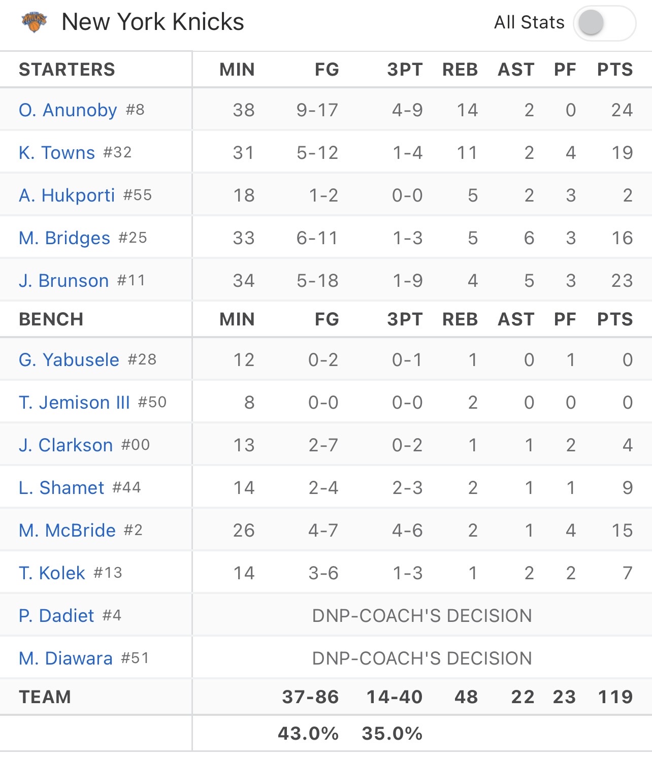 Les Knicks ont pris une belle option pour la win et ils vont même intercepter la remise en jeu pour qu’OG puisse aller dunker solo. Même s’il va rester quelques secondes après ça cette fois la messe est dite pour les Cavs. OG va retourner aux LFs pour un 1/2, un dernier shoot manqué par Spida et le match se termine.