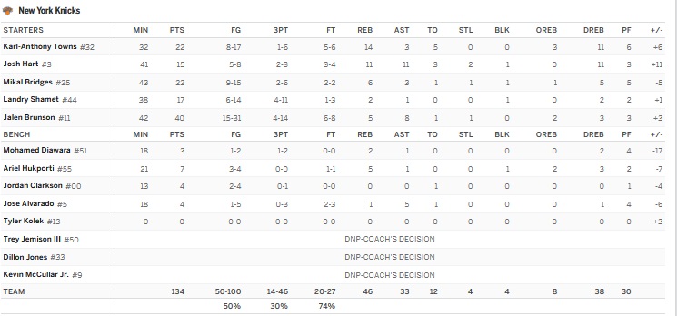 Mikal apporte aussi son scoring, la défense New Yorkaise reste poreuse et les Knicks se retrouvent à -4 à 1:41. Le danger est bien présent, JB va chercher un and one, Siakam manque un layup, JB manque un 3, Mikal fait faute sur son contre sur Siakam à 42s mais Brown challenge. Après review arbitrale la décision est revue et ça part en jumpball que KAT gagne. JB va manquer le shoot, pas Siakam qui score sur Josh. 120-123 à 12.7, temps mort Knicks. Obi chambre sur le banc des Pacers indiquant que Josh est trop petit pour Siakam mais il reste au moins un ballon d’attaque pour New York.
