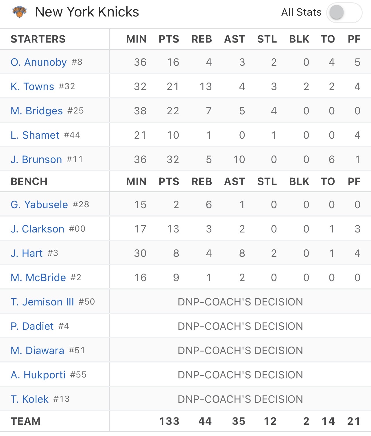 Victoire sur le score final de 133-120, encore plus de 130pts marqué par les Knicks en 2 matchs consécutifs, plus de 55 shoots à 3pts pris (record de franchise) et personne d’autre que les Knicks n’ont réussi à gagner pour le moment au Madison Square Garden. La belle série de victoires des New Yorkais en est maintenant à 5 succès.
