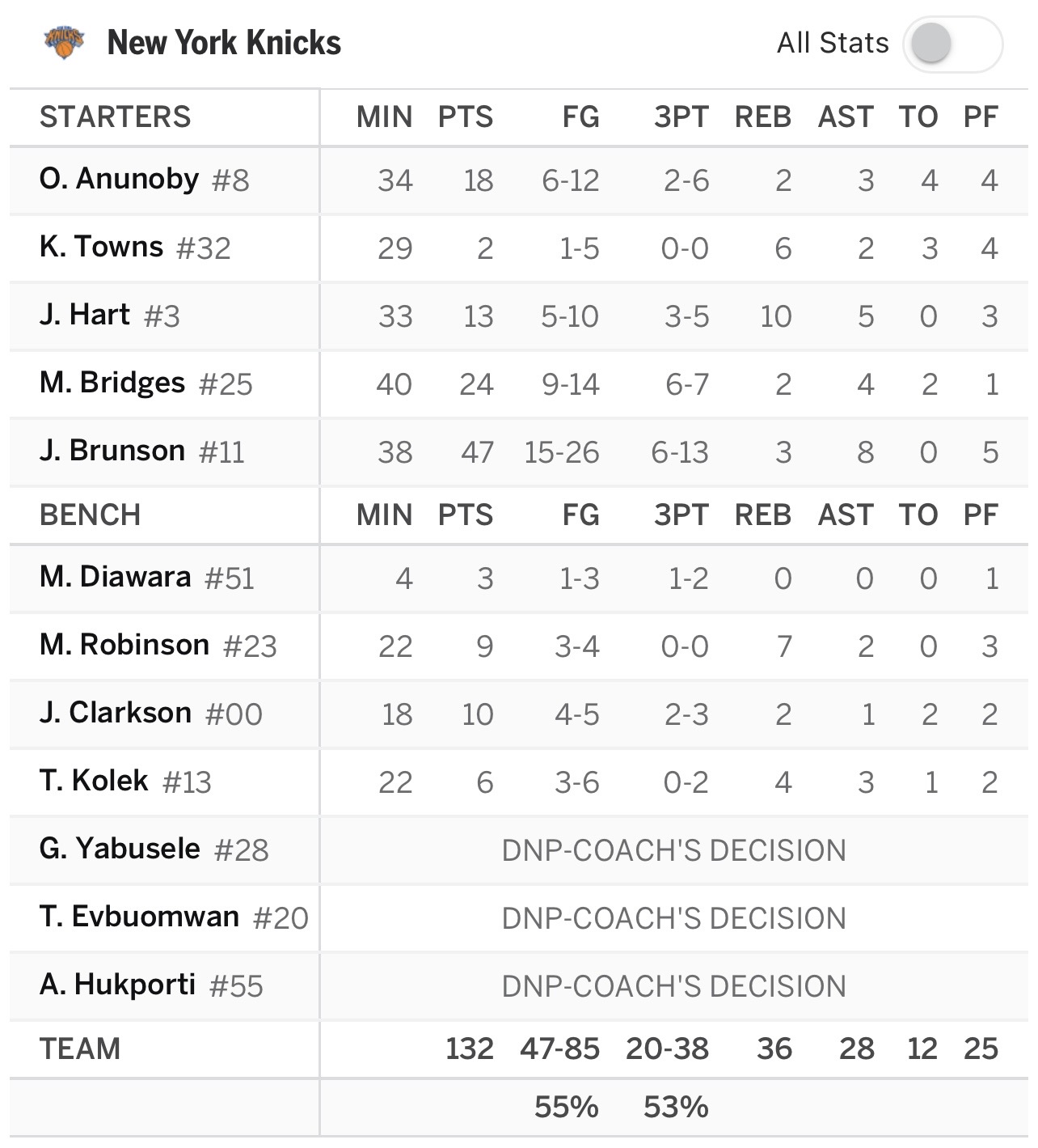 Victoire sur le score final de 132-125, la masterclass de JB, les beaux passages de Mikal et OG, les joueurs du banc qui ont aussi apporté une belle contribution et voilà des Knicks qui retrouvent le chemin de la victoire.