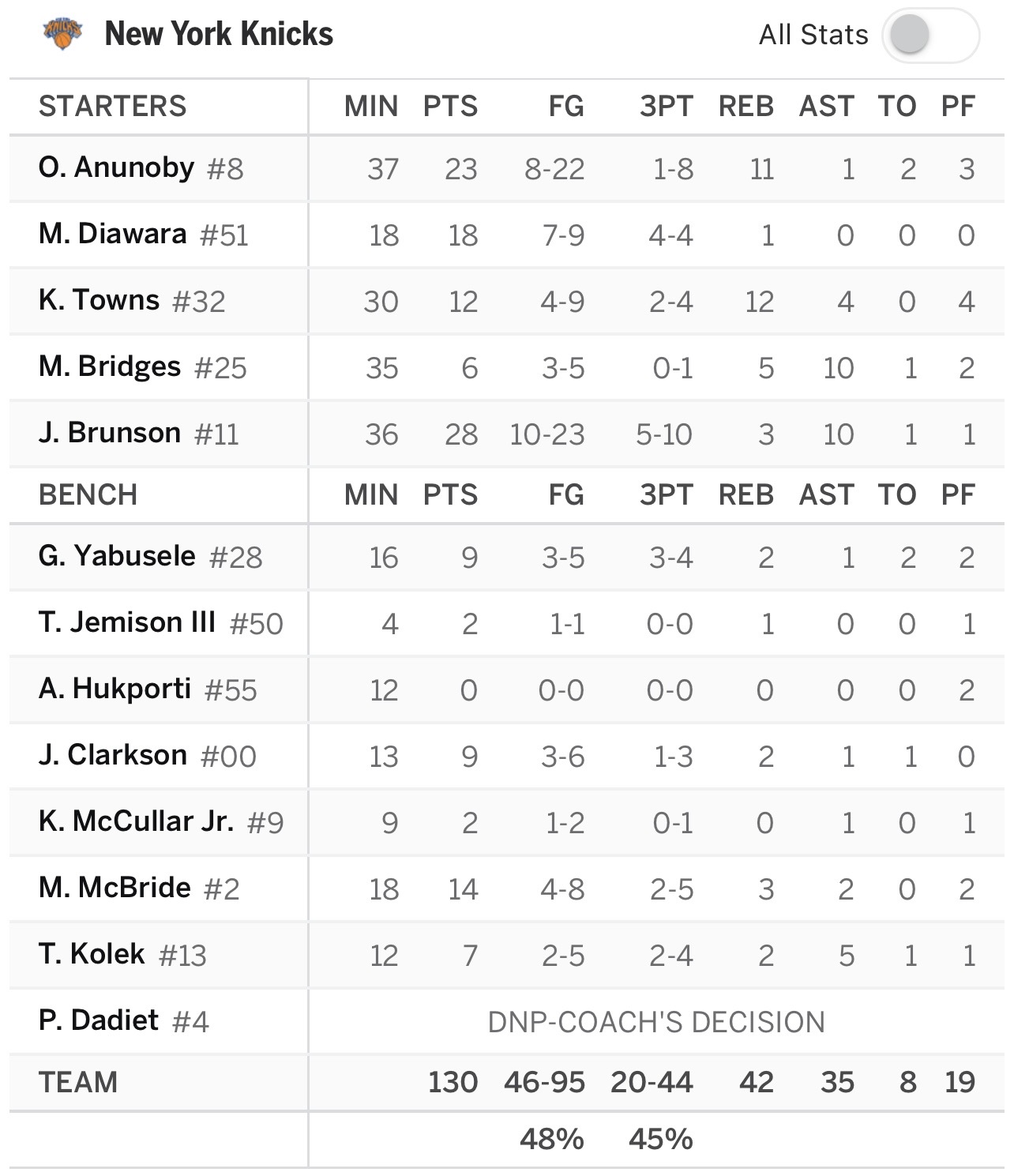 Victoire sur le score final de 130-125. Un scary movie de 48 minutes mais les Knicks s’en sortent très bien au final. Ils se sont fait peur ils nous ont fait peur et pourtant les lignes de stats sont belles. Le coaching de Mike Brown a payé et montre une fois de plus que cette équipe a de la ressource sur son banc mais aussi de la ressource mentale. Il fallait sortir de ce piège et ils ont réussi à le faire.