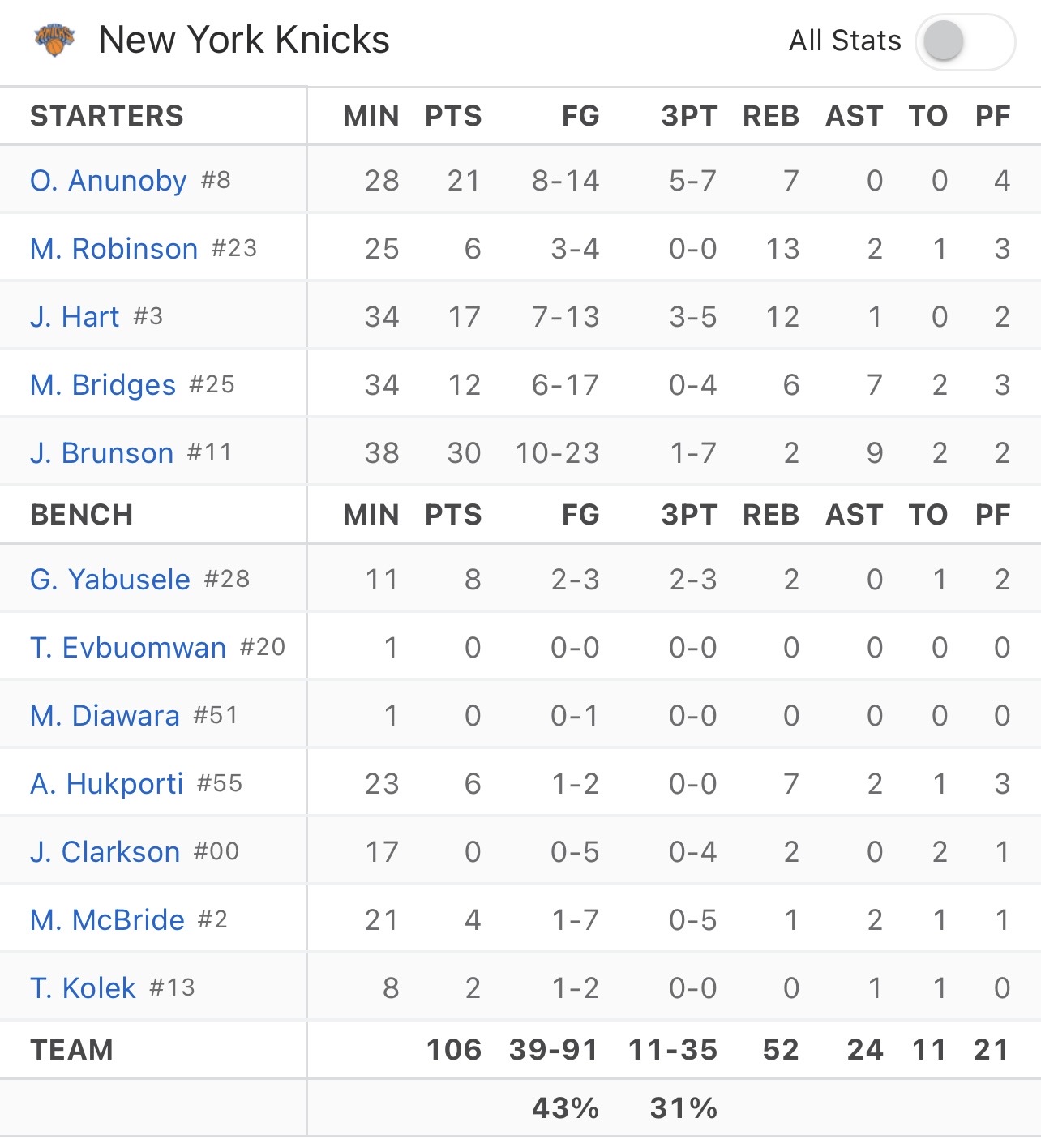 Encore une fois le résultat est acquis avant la fin du temps règlementaire, Richardson va pouvoir aller dunker, Guerschon va aller chercher une faute et faire un 2/2 aux Lfs, Clarkson va revenir à la place d’Hukporti, Orlando va manquer un 3 et Guerschon faire faute au rebond. Isaac sur la ligne ça fait un 2/2 aux Lfs. 47s sur le chrono, le Magic qui marque, Clarkson qui manque sous le cercle et Orlando qui joue le jeu jusqu’au bout avec une autre faute de Guerschon. 1/2 pour Richardson, Brunson qui doit revenir pour les 19 dernières secondes avec Mikal et Josh.