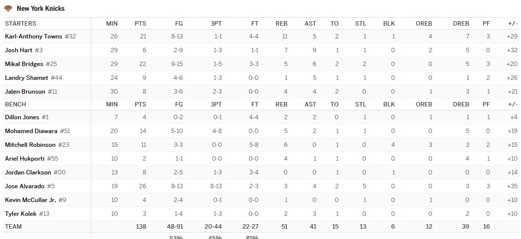 Et le pire dans tout ça c’est que JB a même pas eu besoin de forcer. Alvarado lui avec ses 26pts et son 8/13 à 3pts en sortie de banc termine meilleur marqueur des Knicks.