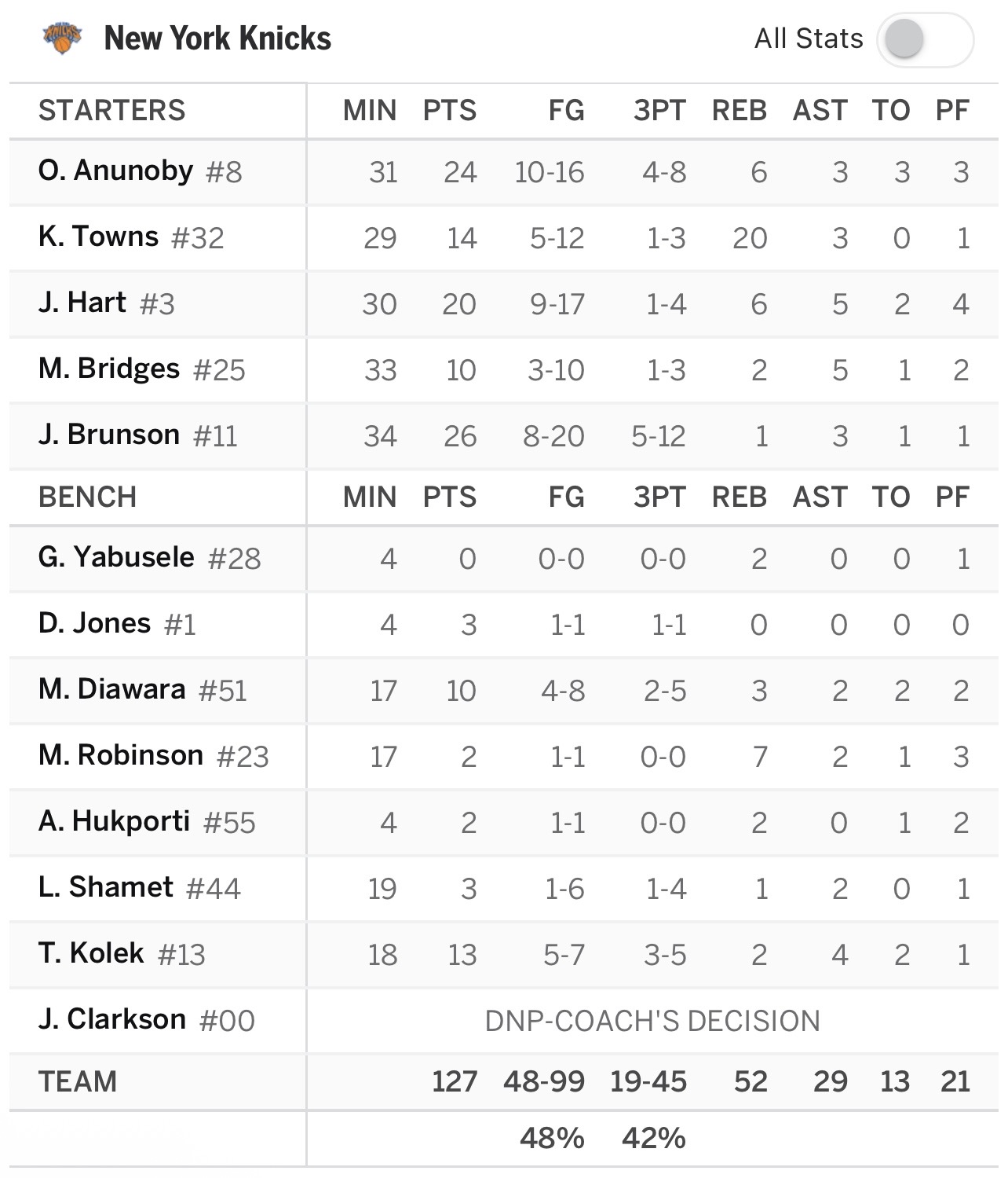 96-74 à 8:55, 3pts Blazers, Kolek qui répond derrière l’arc, Avdija qui va chercher le and one sur Mitch, Hart manque un 3 mais le ballon reste Knicks et c’est KAT qui va scorer. Échec Portland, OG qui dunke une fois de plus et s’affiche à 19pts. Merci à KAT pour la passe, il revient vite à l’attaque mais est stoppé en transition. Pas grave c’est avec un corner 3 qui va dépasser les 20pts à titre personnel. Encore un match très solide pour lui qui affiche une belle moyenne sur les derniers matchs.