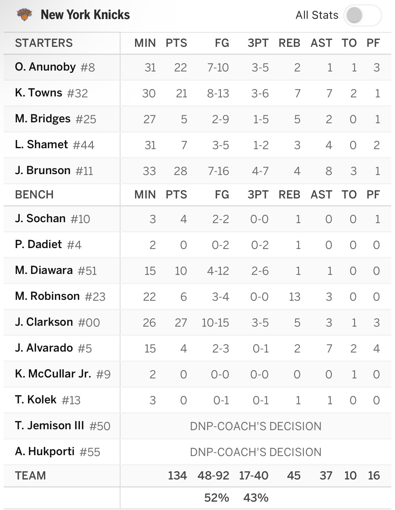 JB rajoute 3pts, 3 du Jazz en réponse, 24s avant que les Knicks ne puissent shooter. A 2:51 et avec 130-111 Brown vide un peu son banc avec Kolek et Sochan. Filipowski marque, Sochan qui marque sur une passe de KAT avant qu’il ne laisse sa place à Mo. Dadiet va suivre aussi quelques instants plus tard. Oui nous sommes dans le garbage time et c’est donc synonyme d’une large win…