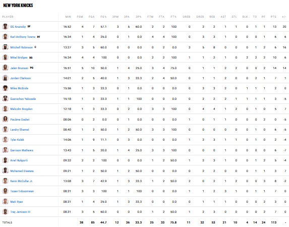 Bridges qui fait faute sur Maxey, Mikal qui termine main droite derrière, OG qui fait 2/2 aux LFs, échec Sixers, des LFs aussi pour Towns et un score qui arrive à 55-45 à 1:12. Échec Sixers, une contre attaque en transition manquée entre JB et Towns. JB qui va finir derrière et un score de 59-47 une fois arrivé l’heure de la mi-temps.