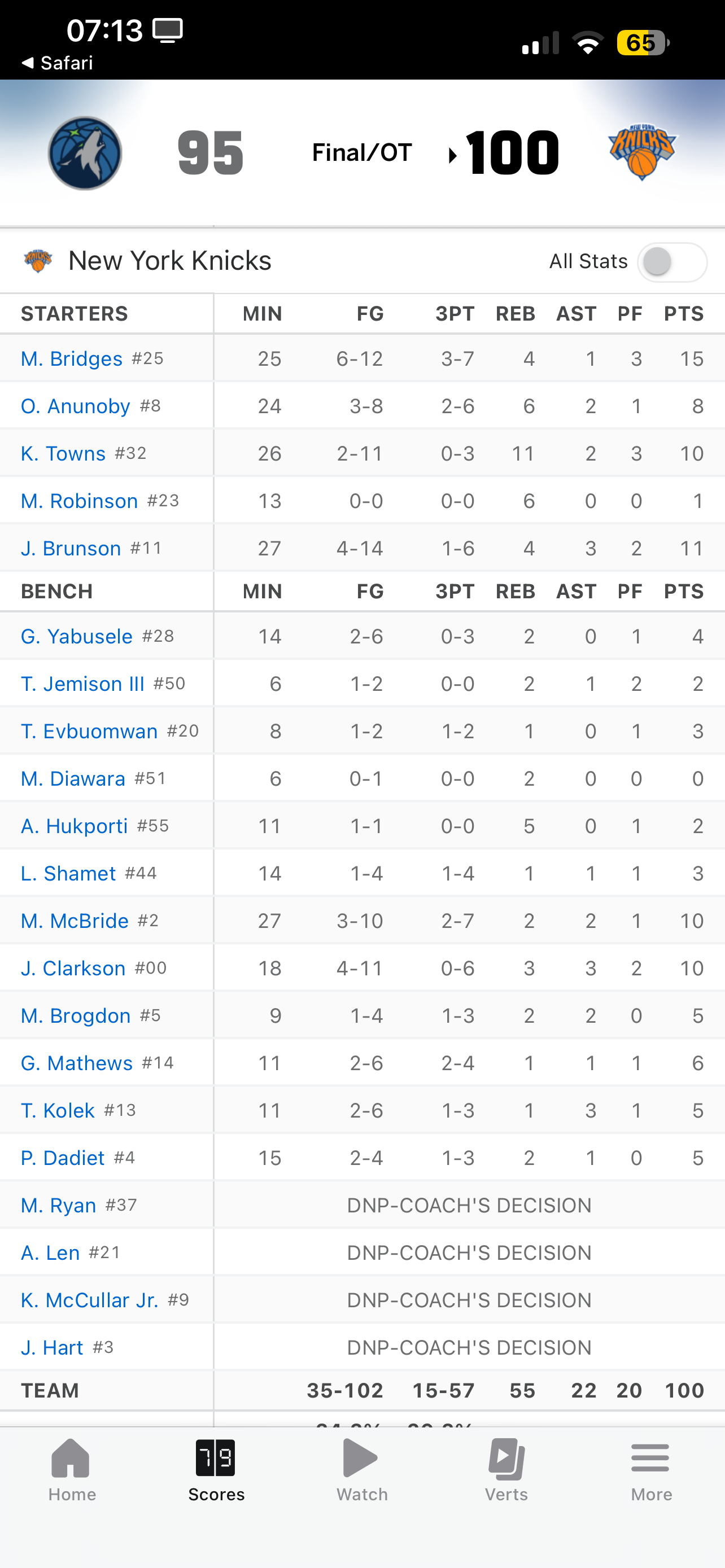 95-90 à 2:57 il est encore trop tôt pour cirer victoire. Un contre Knicks d’Hukporti puis un corner 3 de Mathews en transition redonnent une sérieuse option pour. 2pts Minnesota, Kolek qui score dans la peinture sur une jambe et on atteint les 100pts.